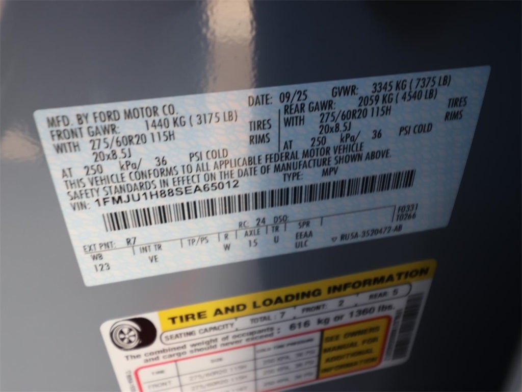 110V/400W AC Power Outlet, 2nd Row Power-Folding Captain's Chairs, 360-Degree Zone Lighting, 3rd Row Flexible Seating, 3rd Row Vinyl Seats, 4-Door Intelligent Access (Lock/Unlock), ActiveX Front Heated Captain's Chairs, BlueCruise Equipped, BlueCruise Equipped (1-Year Plan), Equipment Group 202A High Package, Flex Powered Console, Ford Split Gate, Front Side Laminated Glass, Heated Steering Wheel, Memory Driver Seat, Power Panoramic Vista Roof w/Power Sunshade, Power Tilt/Telescopic Steering Wheel w/Memory, Power-Folding Sideview Mirrors w/Autofold, Rain Sensing Wipers, SecuriCode Keyless Entry Pad, Universal Garage Door Opener, USB Ports, Wheels: 20 Carbonized Gray Bright Machined Aluminum, Wireless Charging Pad.